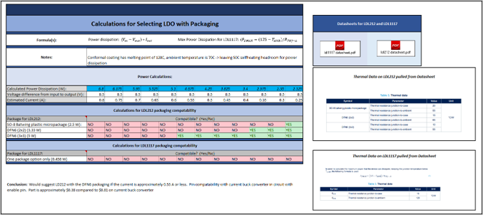 Investigation into swapping out a buck converter to a low-dropout voltage regulator (LDO) to see if there can be cost reductions. Talking to various TI & ST representatives for component suggestions and pricing, I performed calculations to see whether or not the IC would be able to dissipate the power generated.